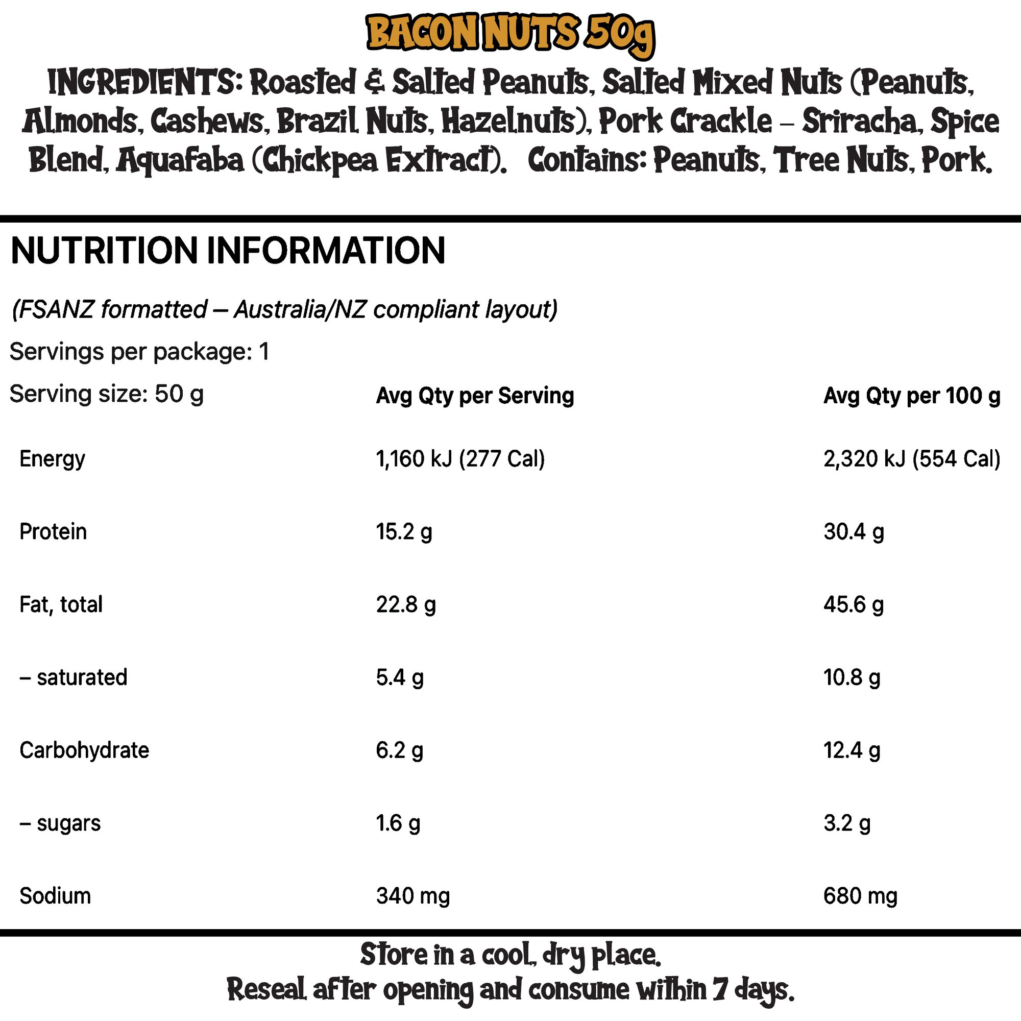 INGREDIENTS: Roasted & Salted Peanuts, Salted Mixed Nuts (Peanuts, Almonds, Cashews, Brazil Nuts, Hazelnuts), Pork Crackle – Sriracha, Spice Blend, Aquafaba (Chickpea Extract).