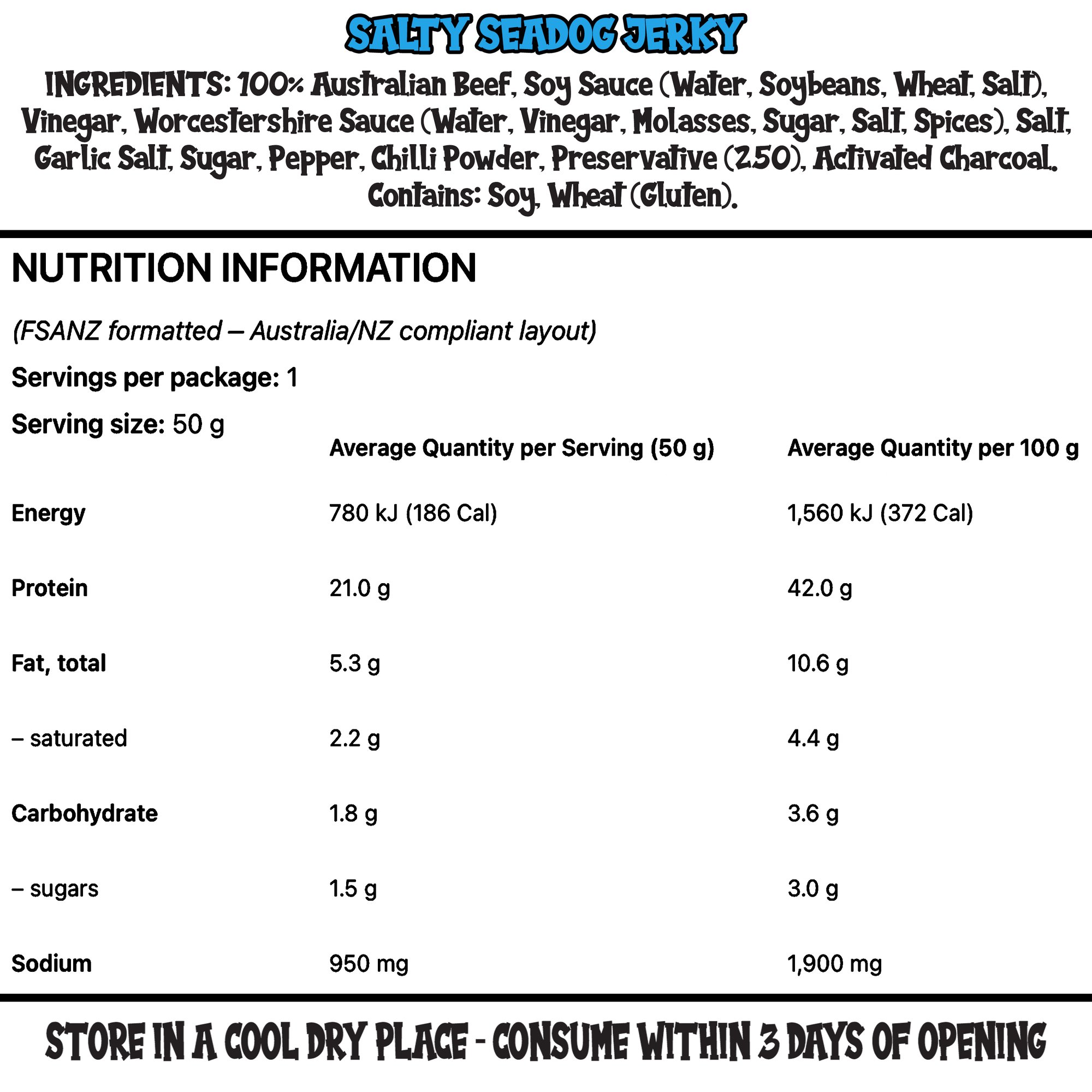 INGREDIENTS: 100% Australian Beef, Soy Sauce (Water, Soybeans, Wheat, Salt), Vinegar, Worcestershire Sauce (Water, Vinegar, Molasses, Sugar, Salt, Spices), Salt, Garlic Salt, Sugar, Pepper, Chilli Powder, Preservative (250), Activated Charcoal.
